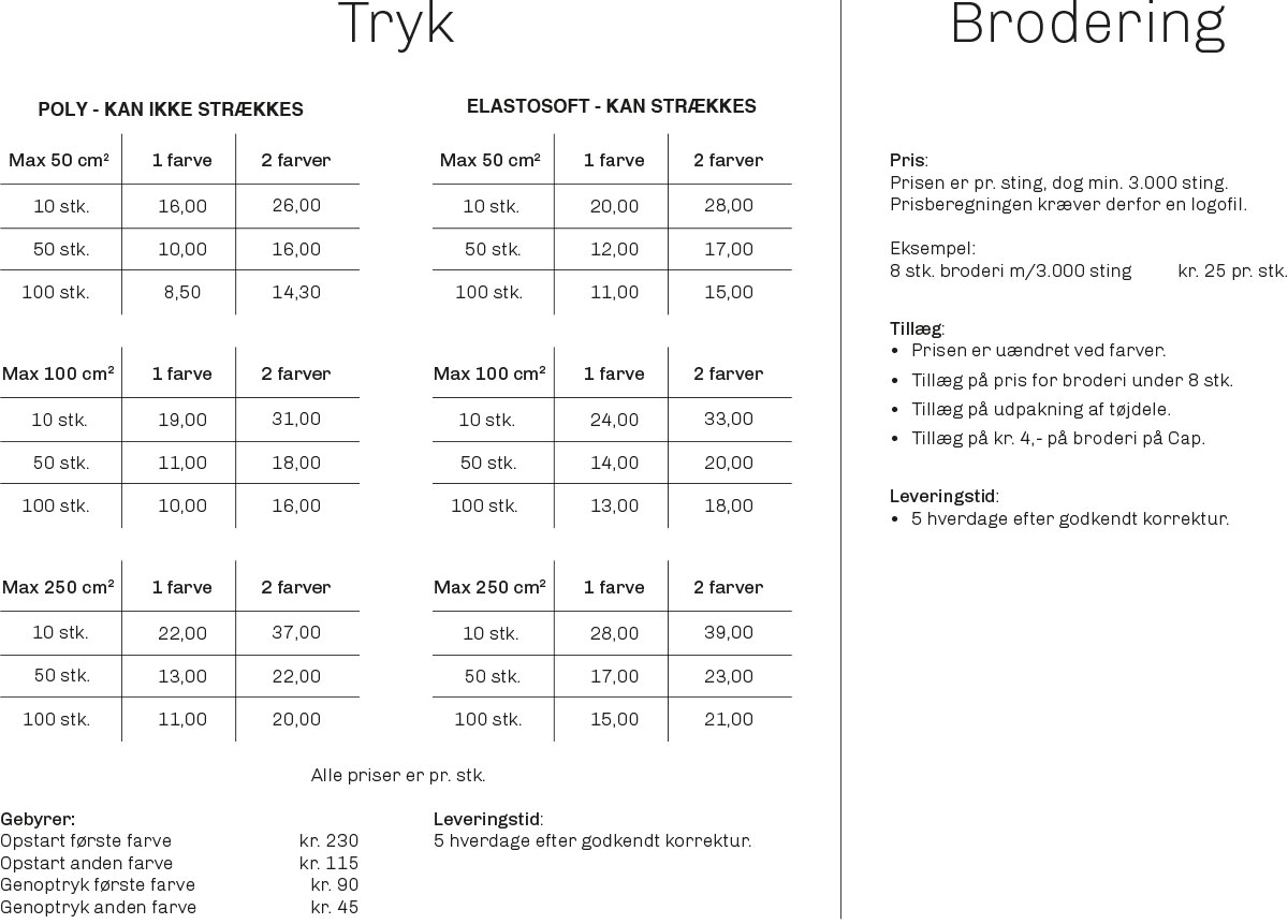 Når du køber arbejdstøj hos Stadsing, kan du samtidig få trykt eller broderet dit logo på tøjet, så det er klar til brug når du modtager det. Vi leverer indenfor 5 hverdage efter vi har modtaget din godkendte korrektur.